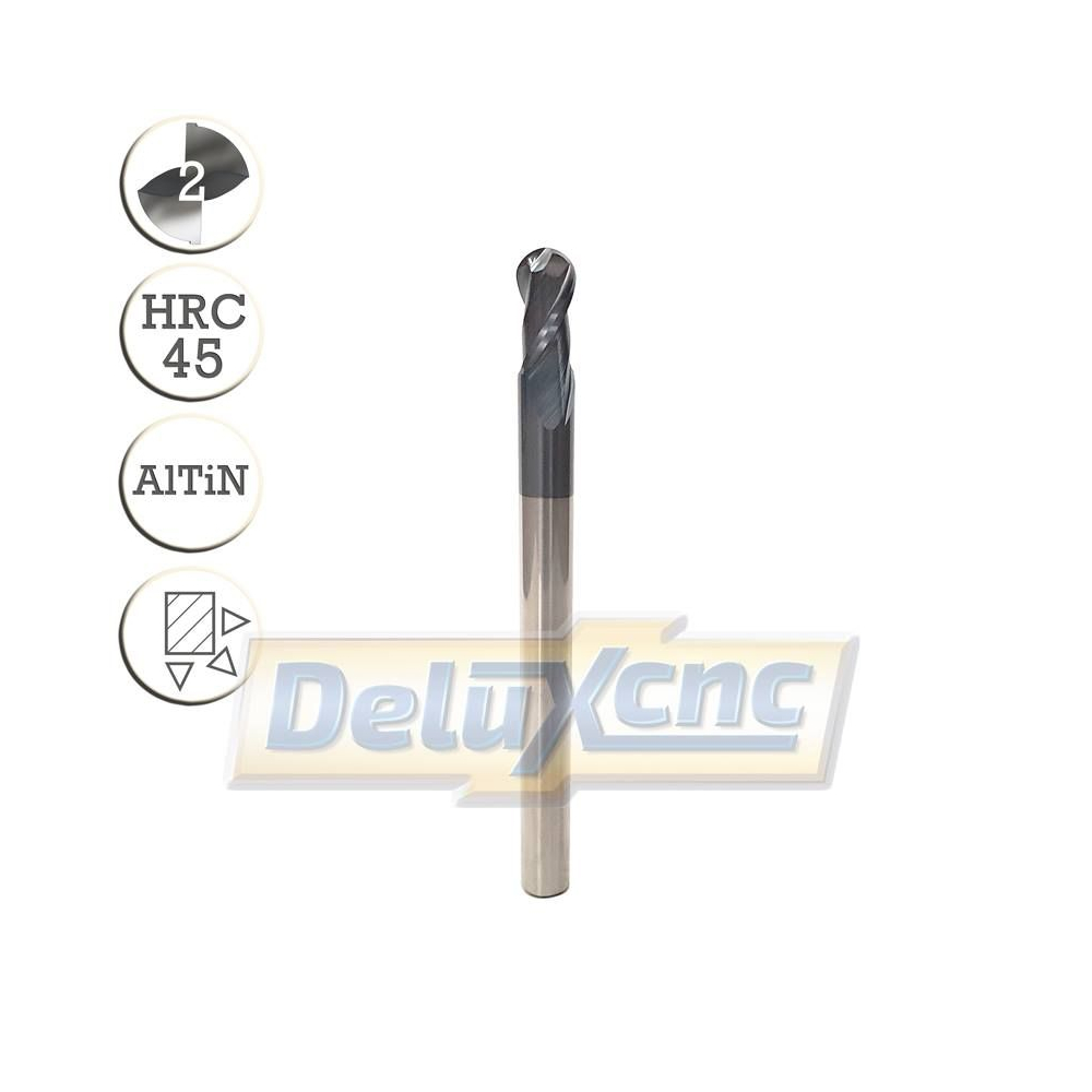 Dvojbritá karbidová kulová fréza s ochranným povlakem AlTiN pro obecné použití. Vhodná do železa, oceli ... do tvrdosti HRC45.
