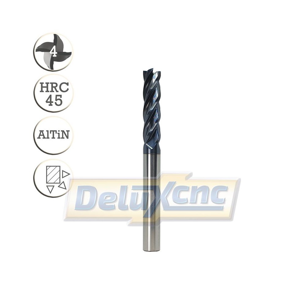 Čtiřbritá karbidová fréza s ochranným povlakem AlTiN pro obecné použití. Vhodná do železa, oceli do tvrdosti HRC45.