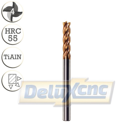 Čtyřbřitá karbidová fréza s ochranným povlakem TiAIN pro všeobecné použití. Vhodná do železa a oceli do tvrdosti HRC55.