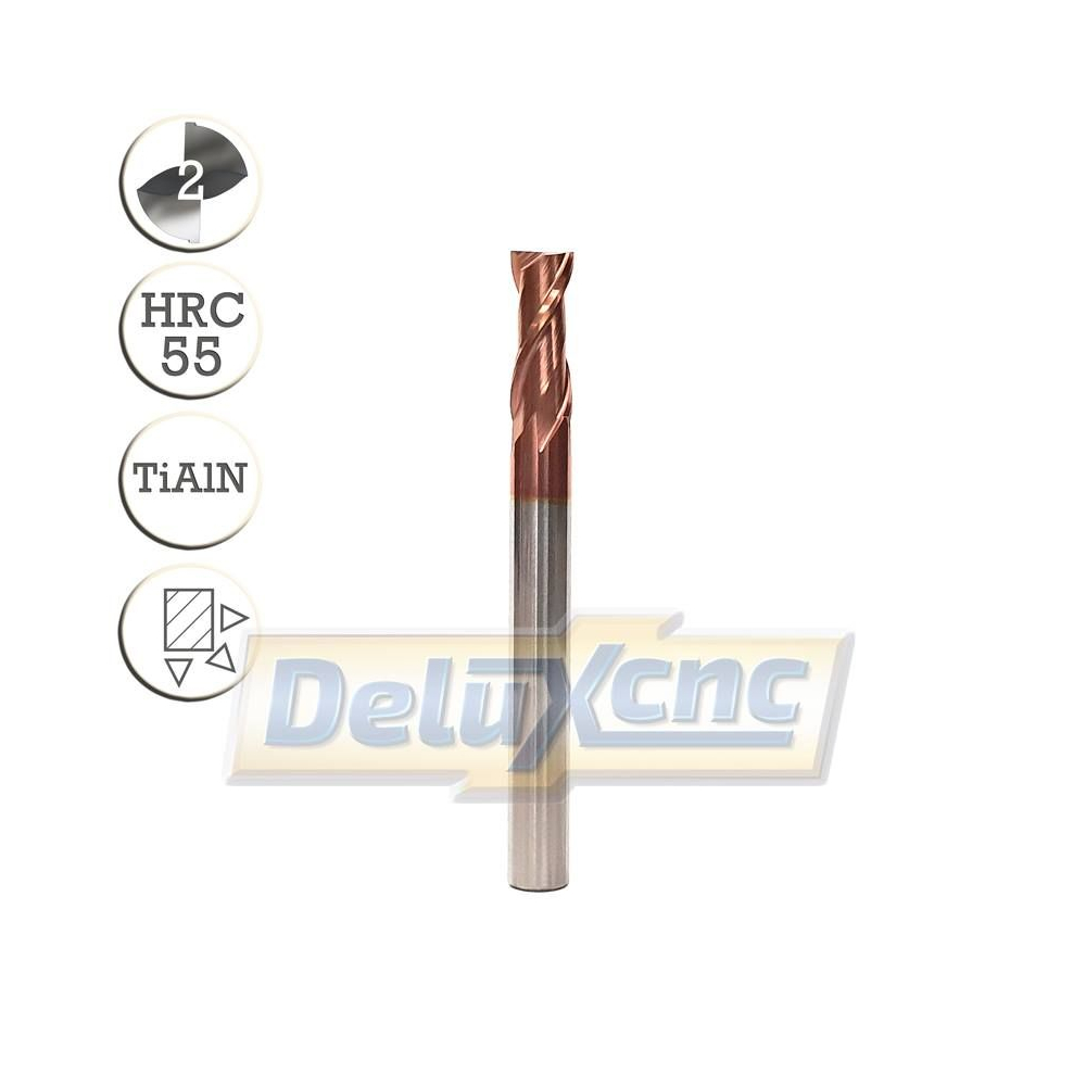 Dvoubřitá karbidová fréza s ochranným povlakem TiAIN pro obecné použití. Vhodná do železa, oceli do tvrdosti HRC55.