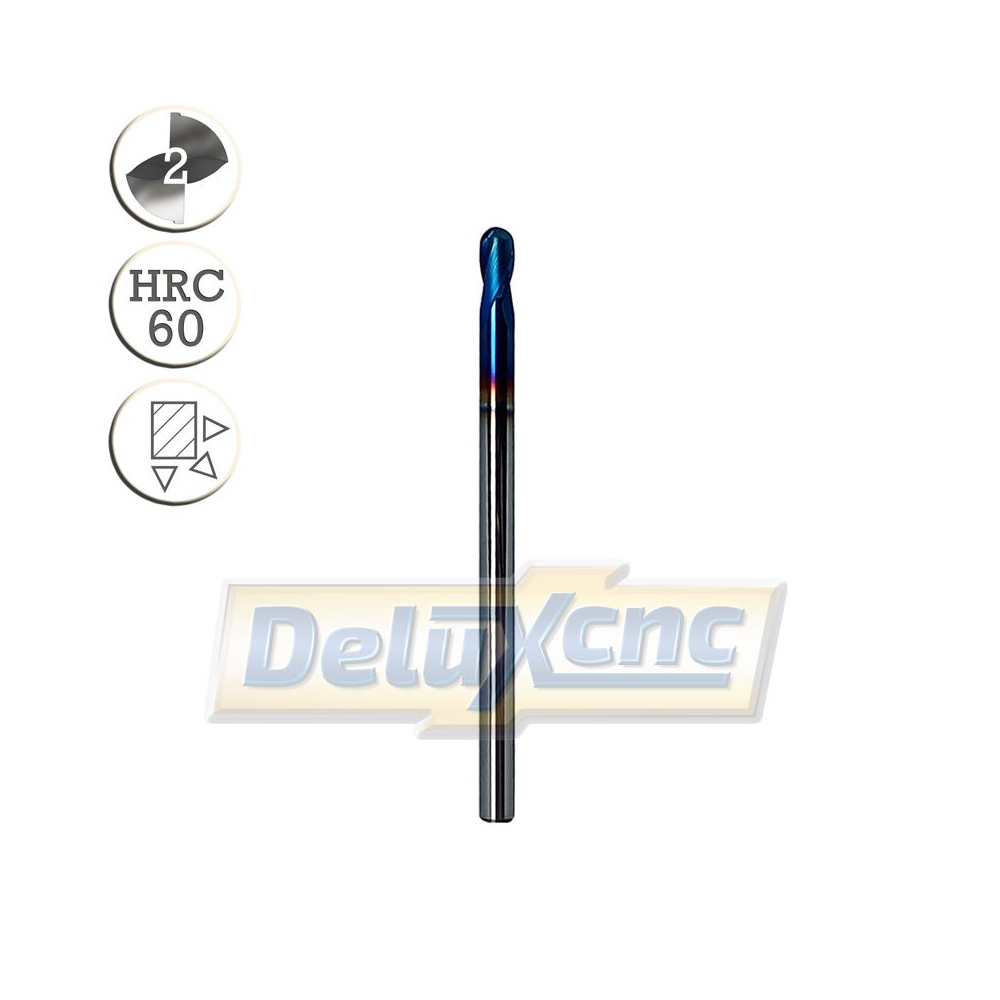 Dvoubřitá kulová karbidová fréza s ochranným povlakem TiAlN F-NaNo Blue k použití do extra tvrdých materiálů. Vhodná do nerezové oceli a oceli do tvrdosti HRC62.
