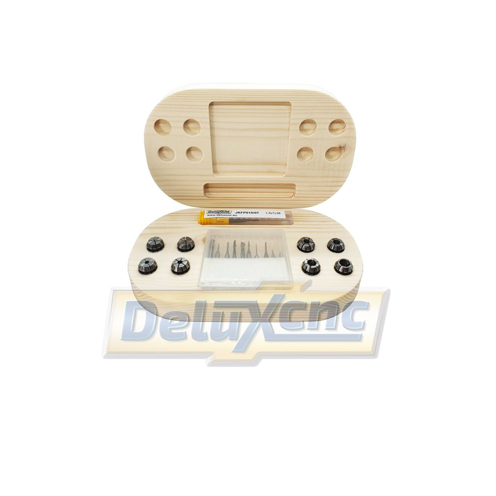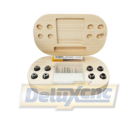 Sada obráběcích nástrojů a kleštin ER11 pro začátečníky ale i pro pokročilé obráběče v dřevěné krabičce. S touto kapesní sadou máte ihned po ruce nástroj nebo upínací kleštinu pro váš projekt. Sada obsahuje nástroje které jsou vhodné do materiálů jako tvrdé, měkké dřevo, překližka, sololid, MDF, Acryl, plasty, Nylon, měděné plošné spoje, dvoubarevné plasty na gravírování atd.