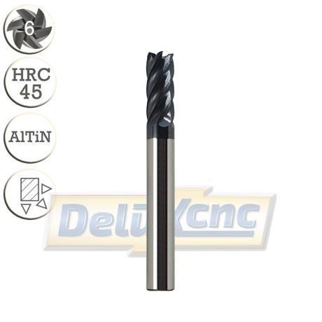 Šestbritá karbidová fréza s ochranným povlakem AlTiN pro obecné použití. Vhodná do železa, oceli do tvrdosti HRC45.