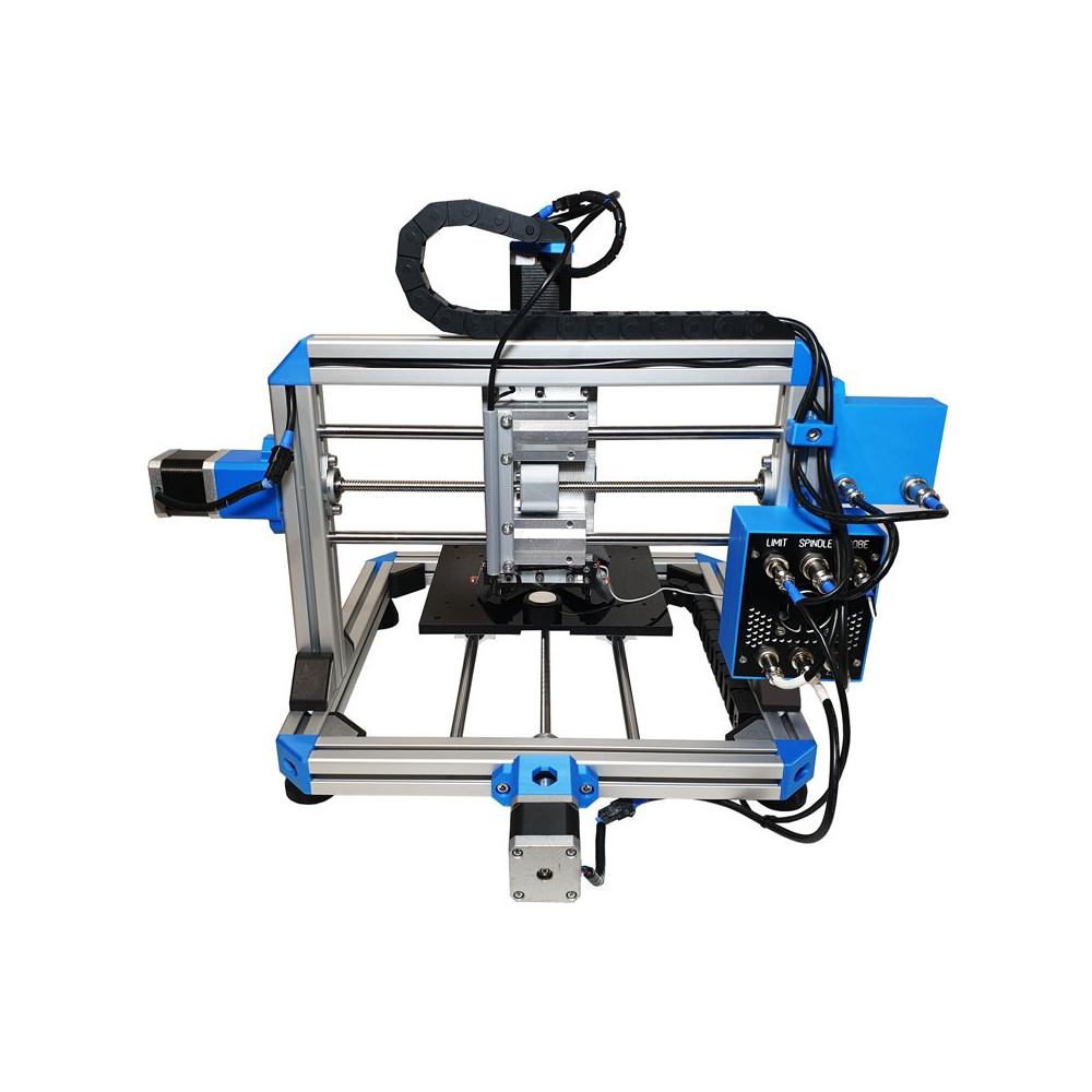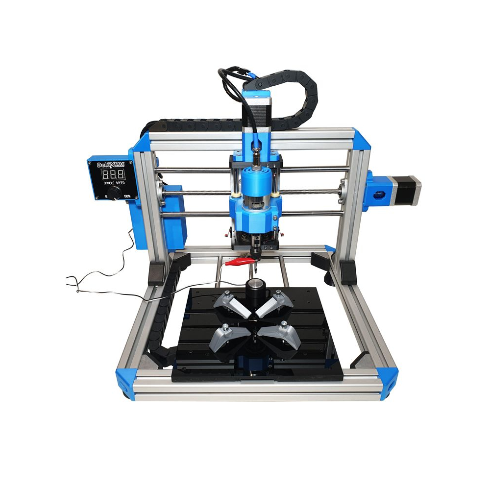 Die luftgekühlte Spindel mit einer maximalen Drehzahl von 12.000 U/min und NEMA17-Schrittmotoren sowie die stabile Konstruktion aus 30x30-Aluminiumprofilen, ergänzt durch 3D-gedruckte Kunststoffteile, verleihen dieser Maschine ausreichend Leistung zum Fräsen, Gravieren und Bohren von leicht zerspanbaren Materialien wie Holz, Kunststoffen, Leiterplatten, Nichteisenmetallen usw. Die Dreh- und Linearbewegung wird durch Trapezgewindespindeln mit einem Gewindetrieb von 8 mm und einer Steigung von 8 mm/U sowie Linearstangen mit einem Durchmesser von 10 mm realisiert, auf denen Linearlager in einem Gehäuse des Typs SC10UU/SC10LUU laufen.