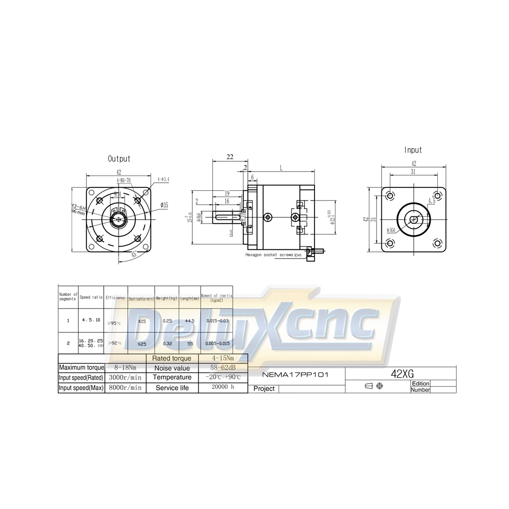 Planetengetriebe mit NEMA17-Flansch für Schrittmotoren mit 5-mm-Wellenanschluss (Wellenlänge ca. 6 mm). Präzises und wirtschaftliches Planetengetriebe für Schrittmotoren mit 42-mm-Flansch.