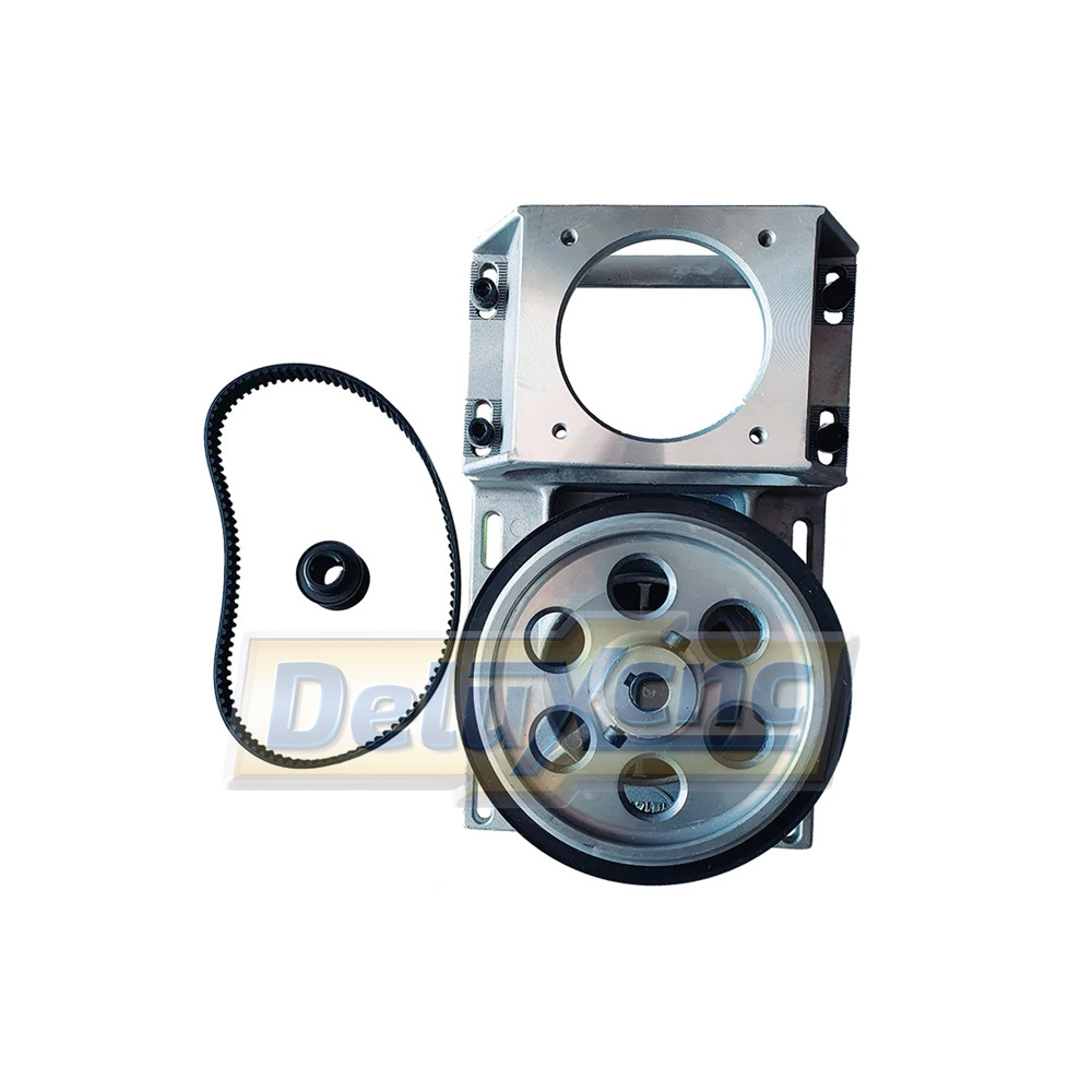 Das Untersetzungsverhältnis beträgt 5:1 (HTD 5M große Riemenscheibe 90 Zähne, HTD 5M kleine Riemenscheibe 18 Zähne – 90/18=5)