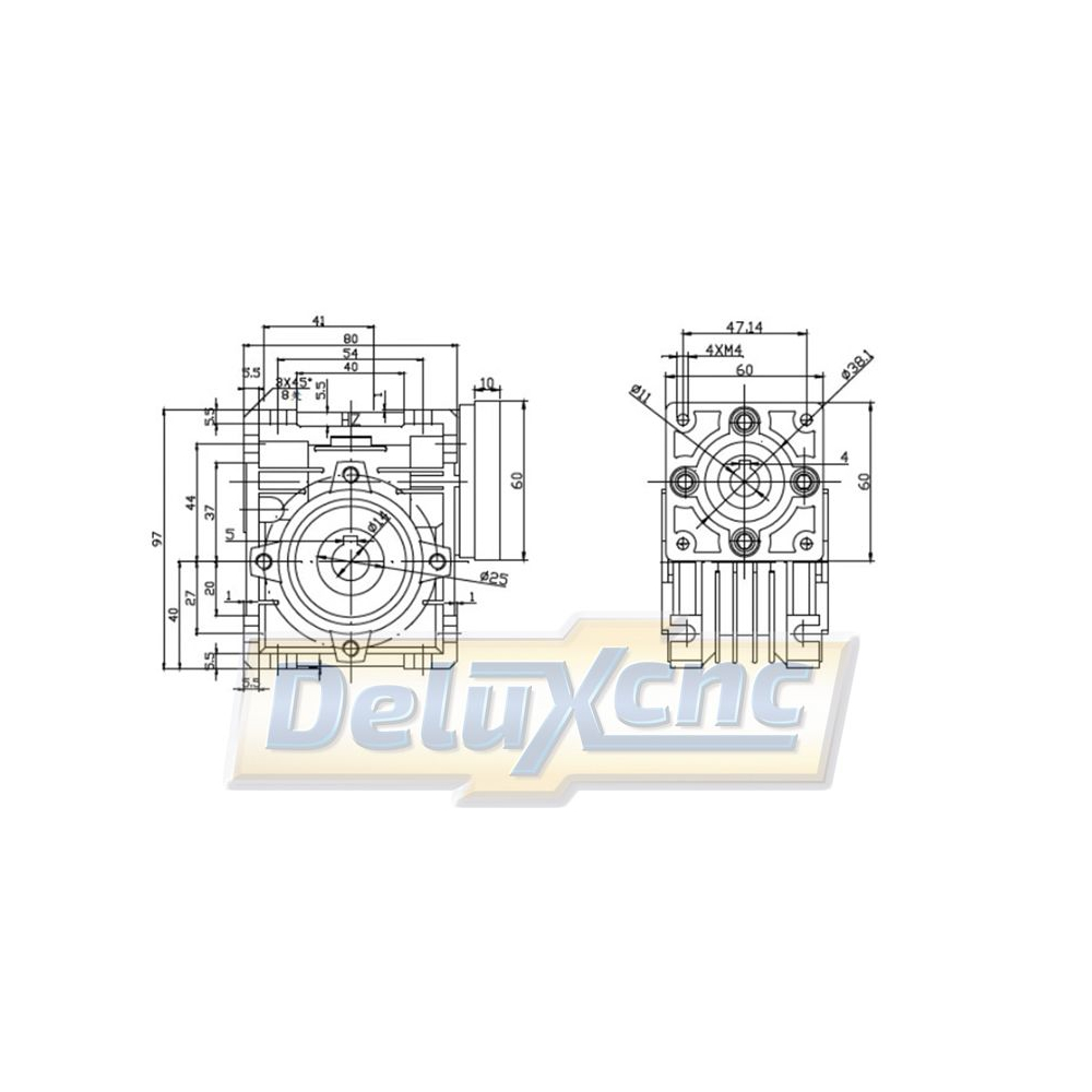 Schneckengetriebe mit NEMA23-Flansch für Schrittmotoren mit 8-mm-D-förmiger Wellenaufnahme. Einseitige oder doppelseitige Welle im Lieferumfang enthalten.