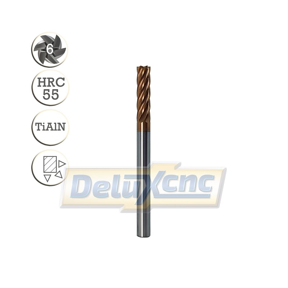 Sechsschneidiger Hartmetallfräser mit TiAlN-Schutzbeschichtung für allgemeine Anwendungen. Geeignet für Eisen und Stahl bis zu einer Härte von HRC 55.