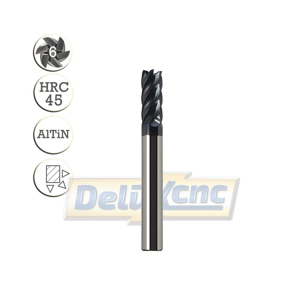Sechsschneidiger Hartmetallfräser mit AlTiN-Schutzbeschichtung für allgemeine Anwendungen. Geeignet für Eisen und Stahl bis zu einer Härte von HRC45.