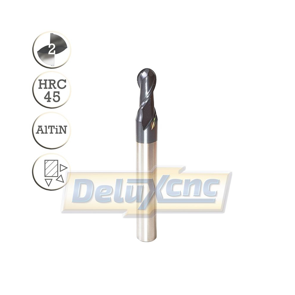 Doppelschneidiger Hartmetallfräser mit AlTiN-Schutzbeschichtung für allgemeine Anwendungen. Geeignet für Eisen, Stahl usw. bis zu einer Härte von HRC 45.
