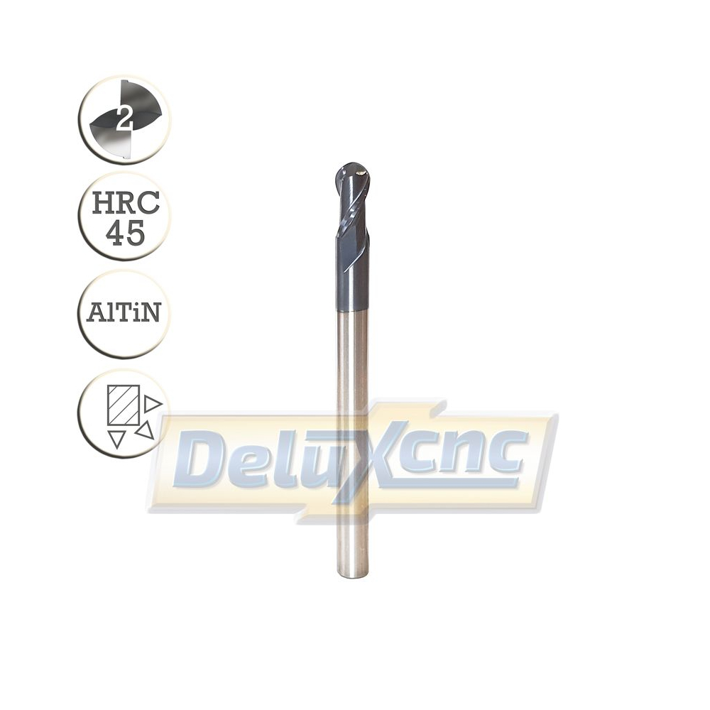 Doppelschneidiger Hartmetallfräser mit TiAlN-Schutzbeschichtung für allgemeine Anwendungen. Geeignet für Eisen, Stahl usw. bis zu einer Härte von HRC 45.