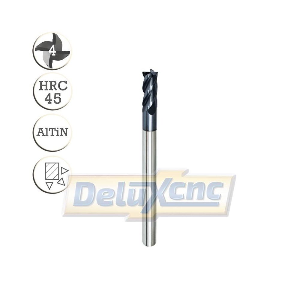 Vierschneidiger Hartmetallfräser mit AlTiN-Schutzbeschichtung für allgemeine Anwendungen. Geeignet für Eisen und Stahl bis zu einer Härte von HRC45.