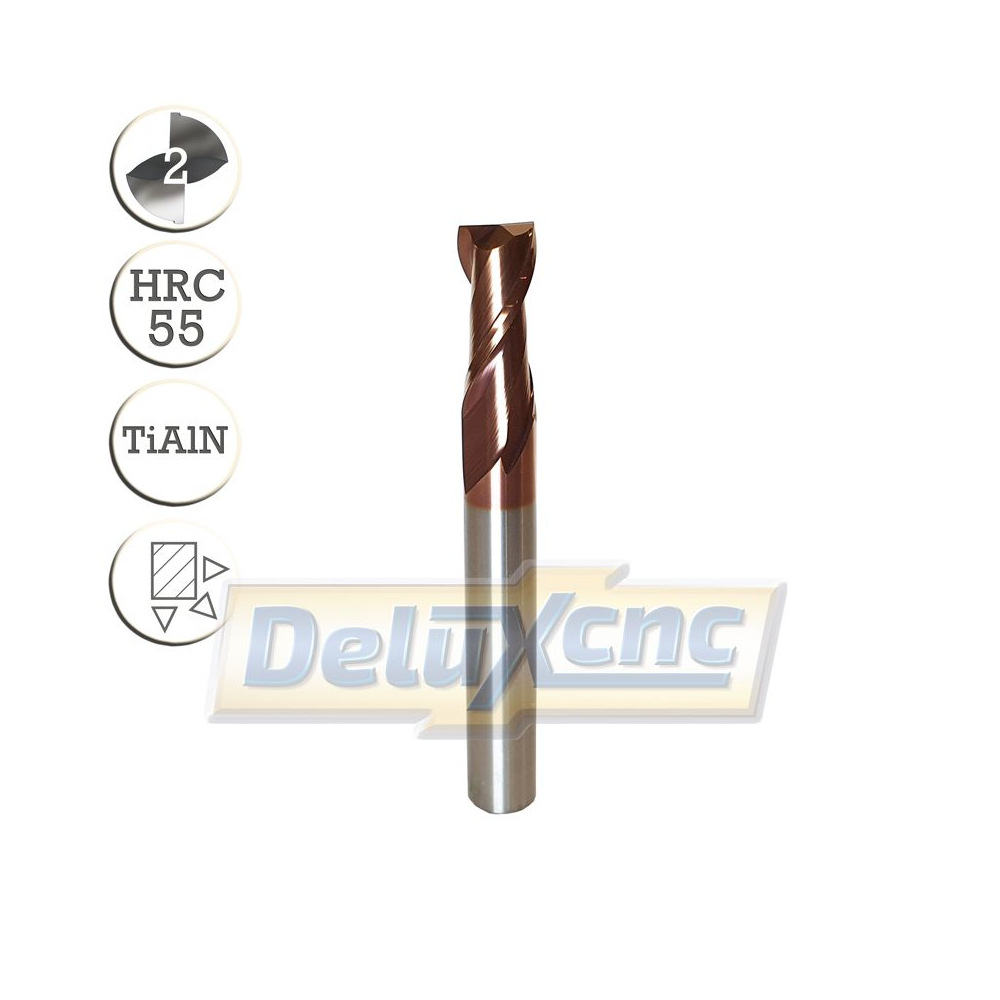 Doppelschneidiger Hartmetallfräser mit TiAlN-Schutzbeschichtung für allgemeine Anwendungen. Geeignet für Eisen und Stahl bis zu einer Härte von HRC 55.