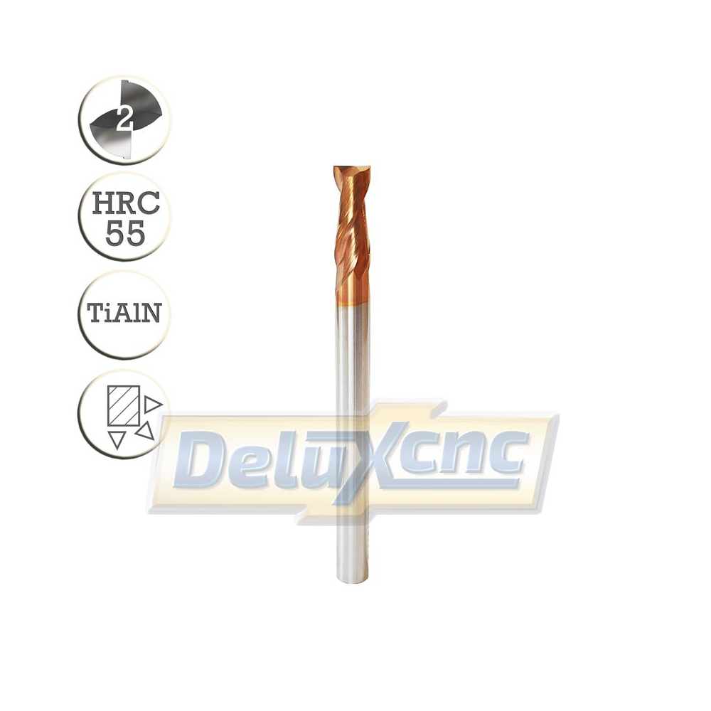 Doppelschneidiger Hartmetallfräser mit TiAlN-Schutzbeschichtung für allgemeine Anwendungen. Geeignet für Eisen und Stahl bis zu einer Härte von HRC 55.