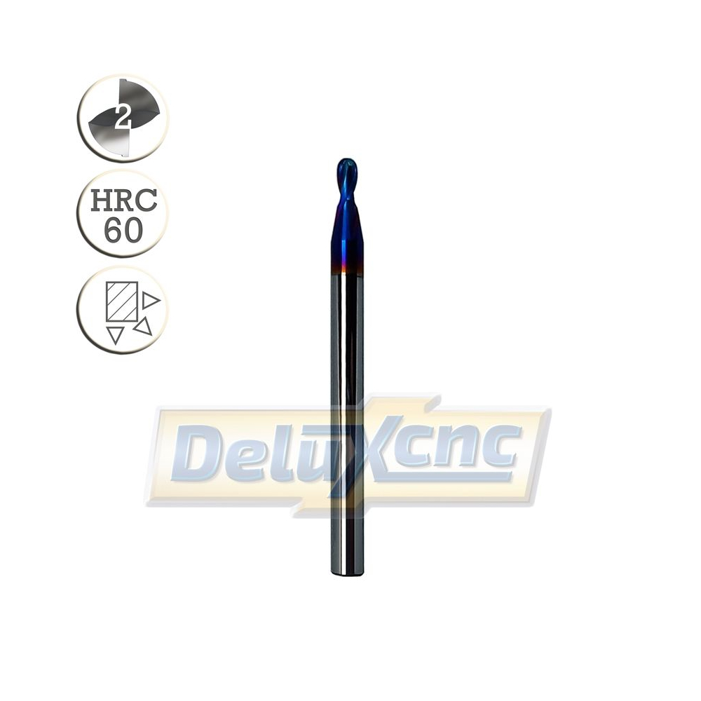 Doppelschneidiger Kugelkopffräser aus Hartmetall mit blauer TiAlN-F-NaNo-Schutzbeschichtung für besonders harte Werkstoffe. Geeignet für Edelstahl und Stahl bis HRC 62.