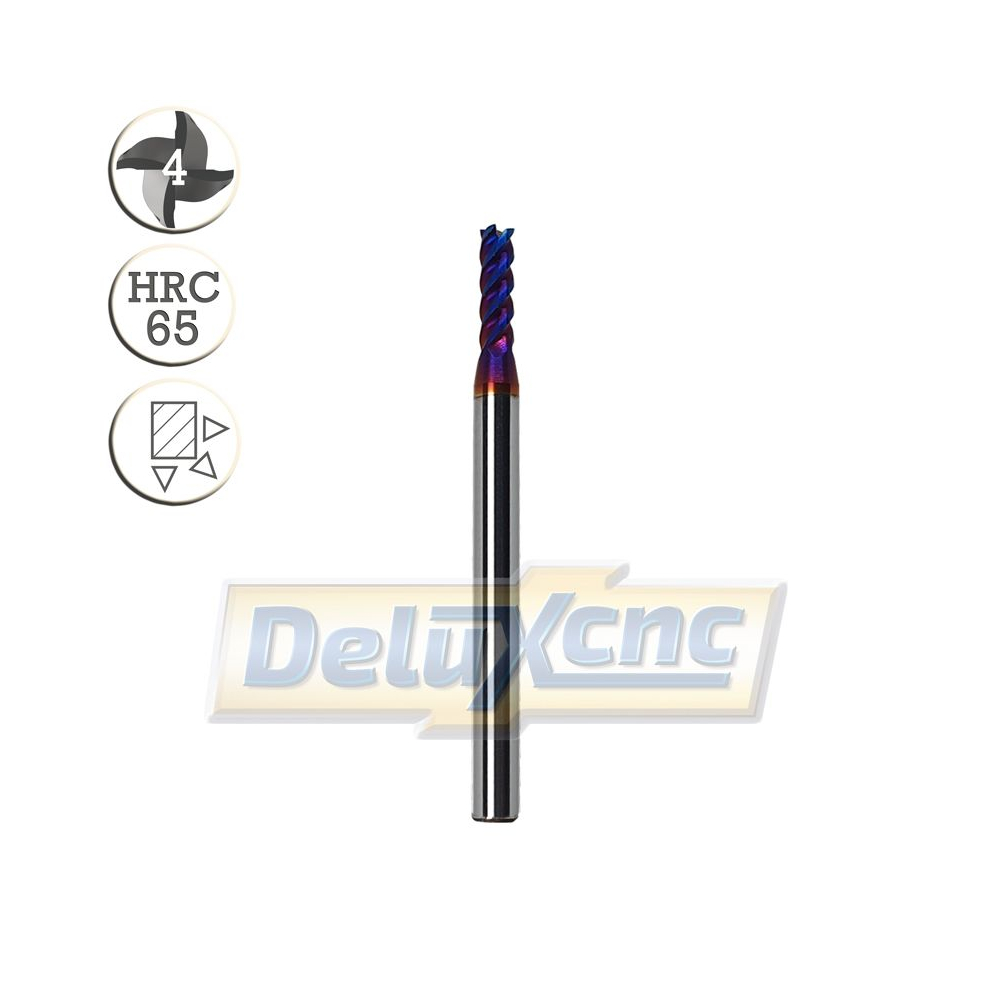 Vierschneidiger Hartmetallschneider mit blauer TiAlN-F-NaNo-Schutzbeschichtung für besonders harte Werkstoffe. Geeignet für Edelstahl und Stahl bis HRC 65.
