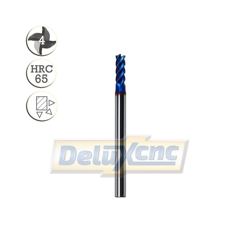 Vierschneidiger Hartmetallschneider mit blauer TiAlN-F-NaNo-Schutzbeschichtung für besonders harte Werkstoffe. Geeignet für Edelstahl und Stahl bis HRC 65.