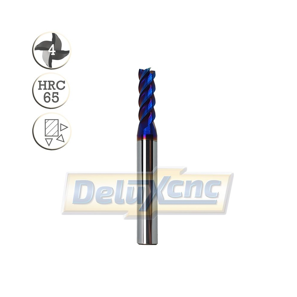 Vierschneidiger Hartmetallschneider mit blauer TiAlN-F-NaNo-Schutzbeschichtung für besonders harte Werkstoffe. Geeignet für Edelstahl und Stahl bis HRC 65.