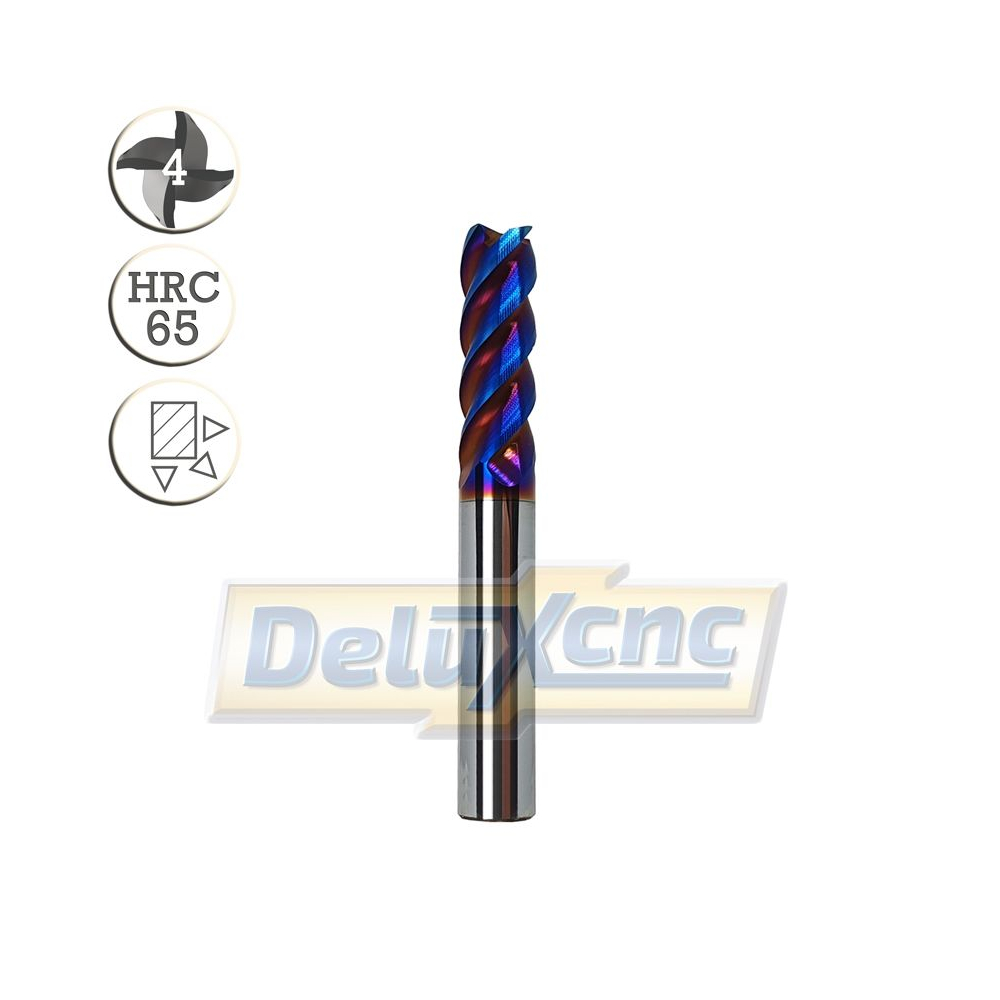 Vierschneidiger Hartmetallschneider mit blauer TiAlN-F-NaNo-Schutzbeschichtung für besonders harte Werkstoffe. Geeignet für Edelstahl und Stahl bis HRC 65.