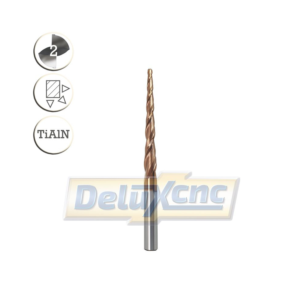Doppelschneidiger Hartmetall-Kegelfräser mit TiAlN-Schutzbeschichtung für allgemeine Anwendungen. Geeignet für Holz und Werkstoffe bis zu einer Härte von HRC 55.