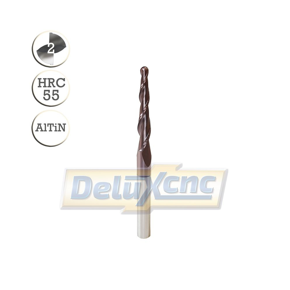 Hochwertiger, doppelseitiger, konischer Hartmetall-Kugelfräser mit AlTiN-Schutzbeschichtung für allgemeine Anwendungen. Geeignet für Holz und Werkstoffe bis zu einer Härte von HRC 55.