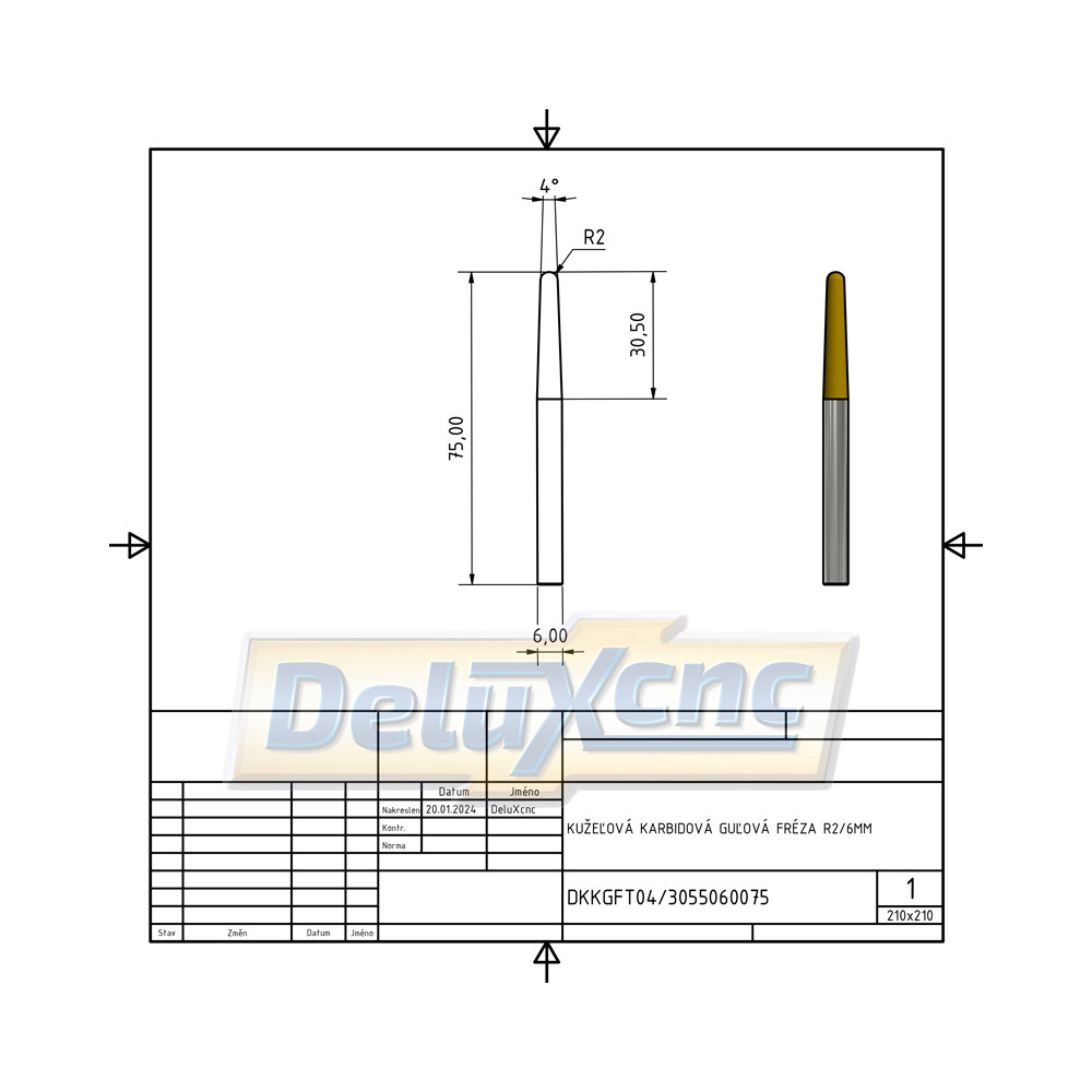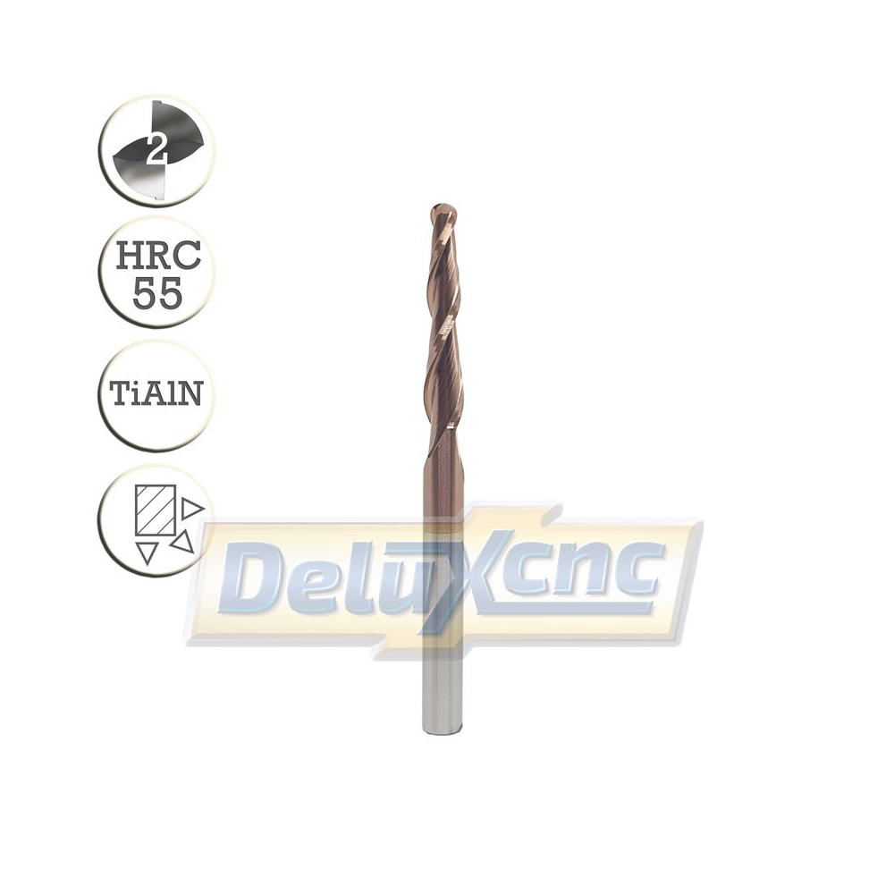 Hochwertiger, doppelseitiger, konischer Hartmetall-Kugelfräser mit TiAlN-Beschichtung für allgemeine Anwendungen. Geeignet für Holz und Werkstoffe bis zu einer Härte von HRC 55.