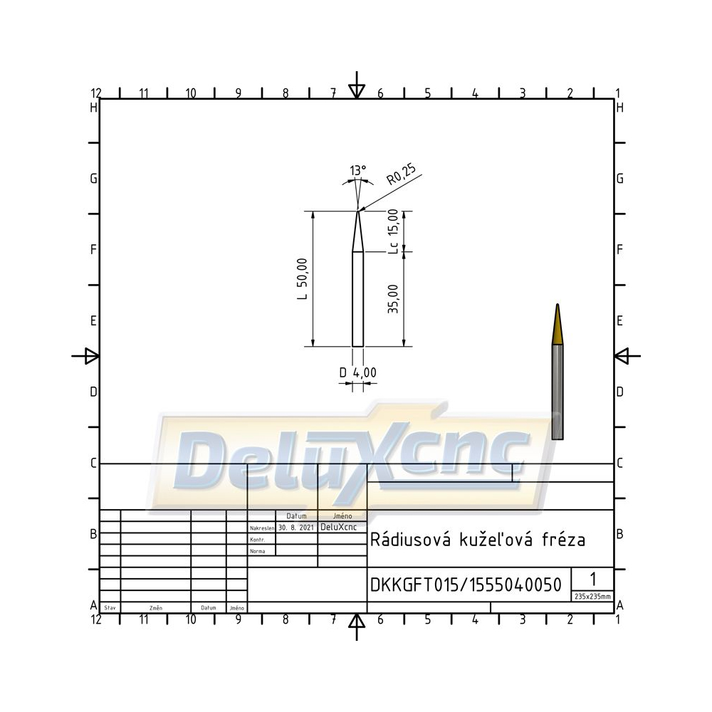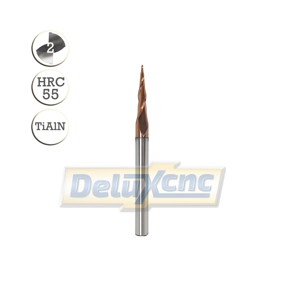 Doppelschneidiger Hartmetall-Kegelfräser mit TiAlN-Schutzbeschichtung für allgemeine Anwendungen. Geeignet für Holz und Werkstoffe bis zu einer Härte von HRC 55.