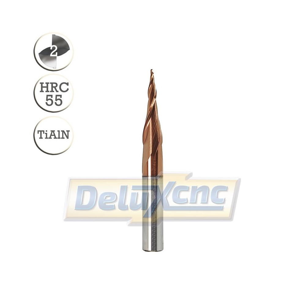 Doppelschneidiger Hartmetall-Kegelfräser mit TiAlN-Schutzbeschichtung für allgemeine Anwendungen. Geeignet für Holz und Werkstoffe bis zu einer Härte von HRC 55.