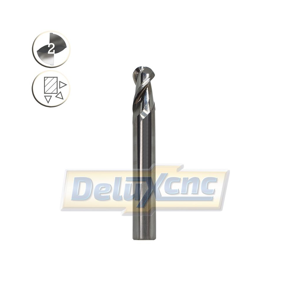 Doppelschneidiger Hartmetall-Kugelfräser, besonders geeignet für die Bearbeitung von Aluminium und Nichteisenmetallen.