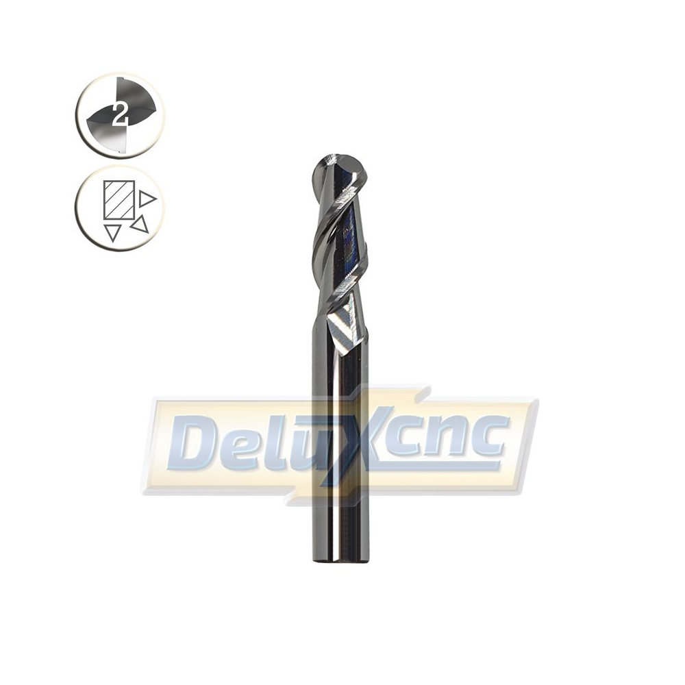 Doppelschneidiger Hartmetall-Kugelfräser, besonders geeignet für die Bearbeitung von Aluminium und Nichteisenmetallen.