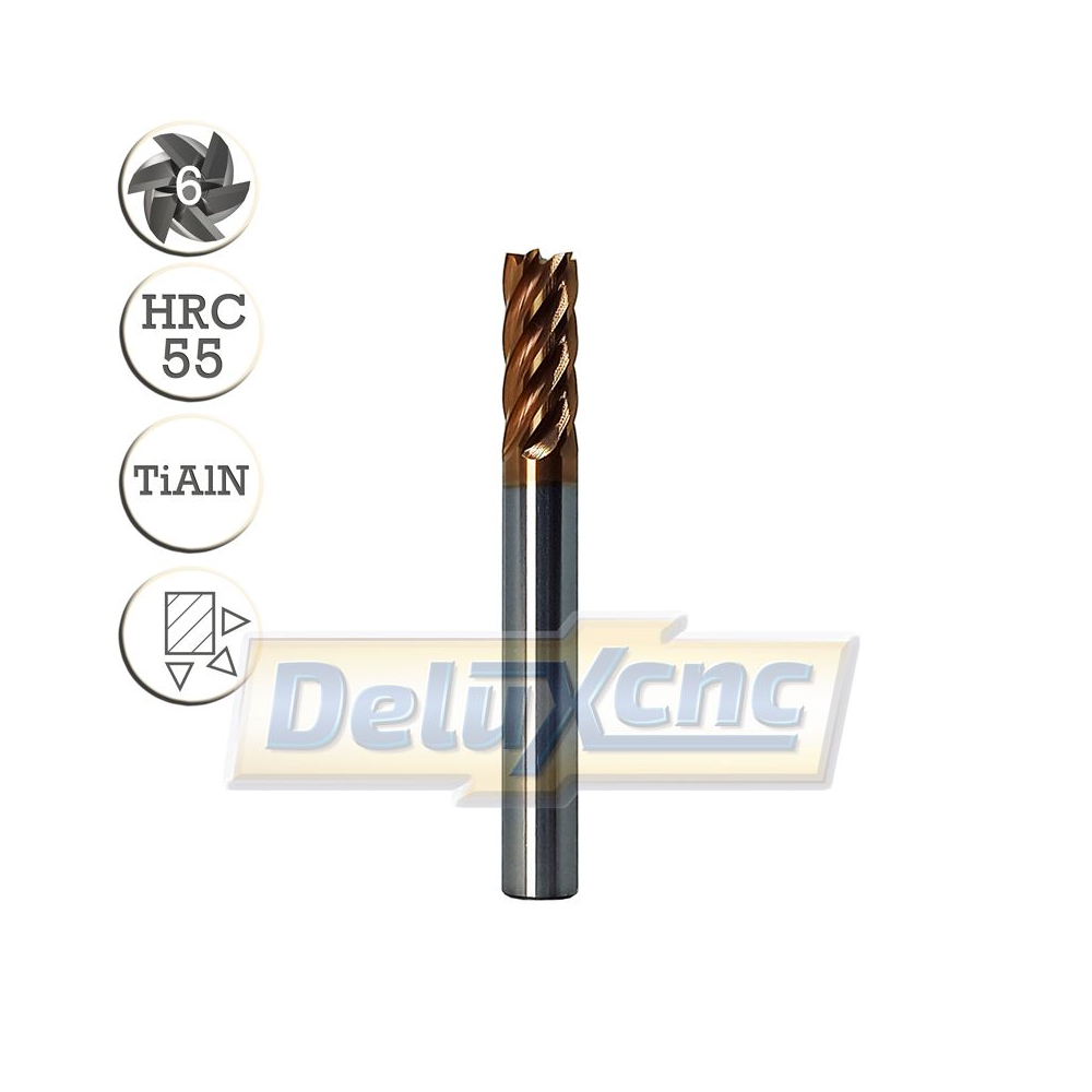 Six flute carbide end mill with TiAIN protective coating for general use. Suitable for iron, steel... to hardness HRC55.