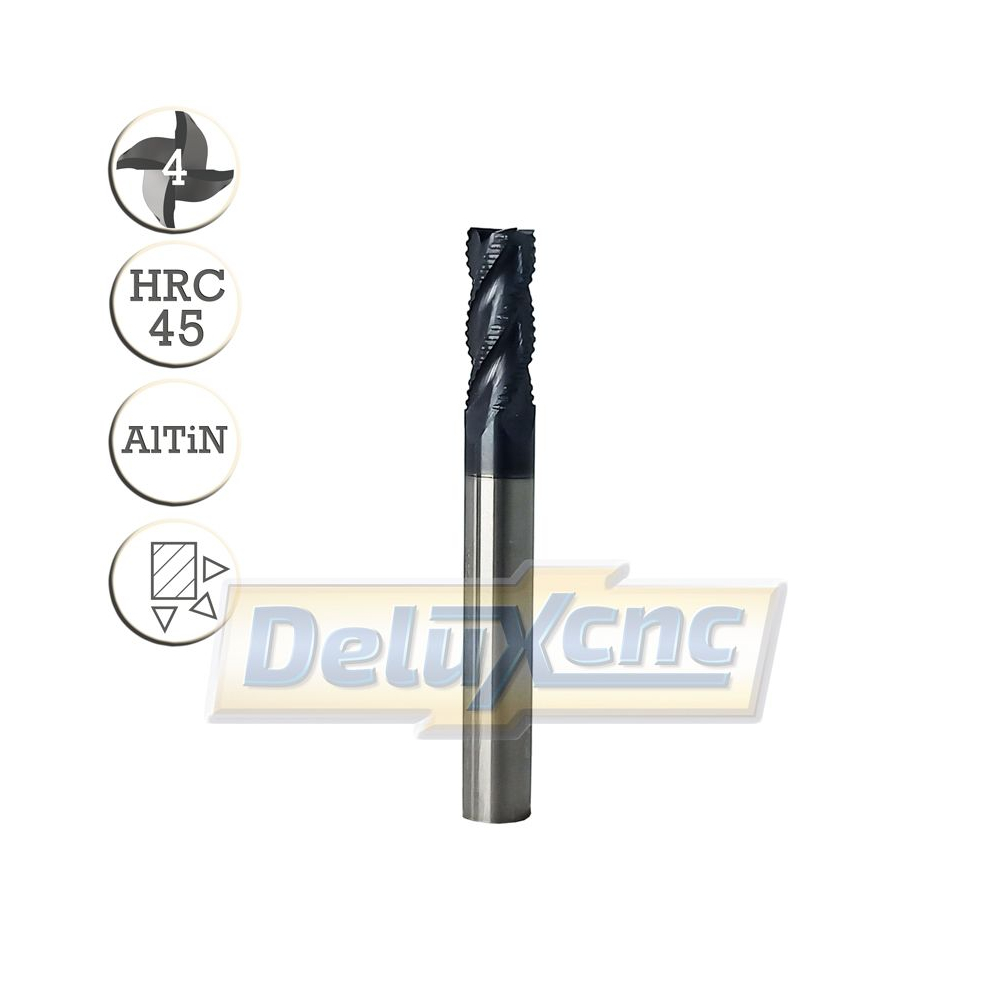 FouR flute carbide end mill with TiAIN protective coating for general use. Suitable for iron, steel... to hardness HRC45.