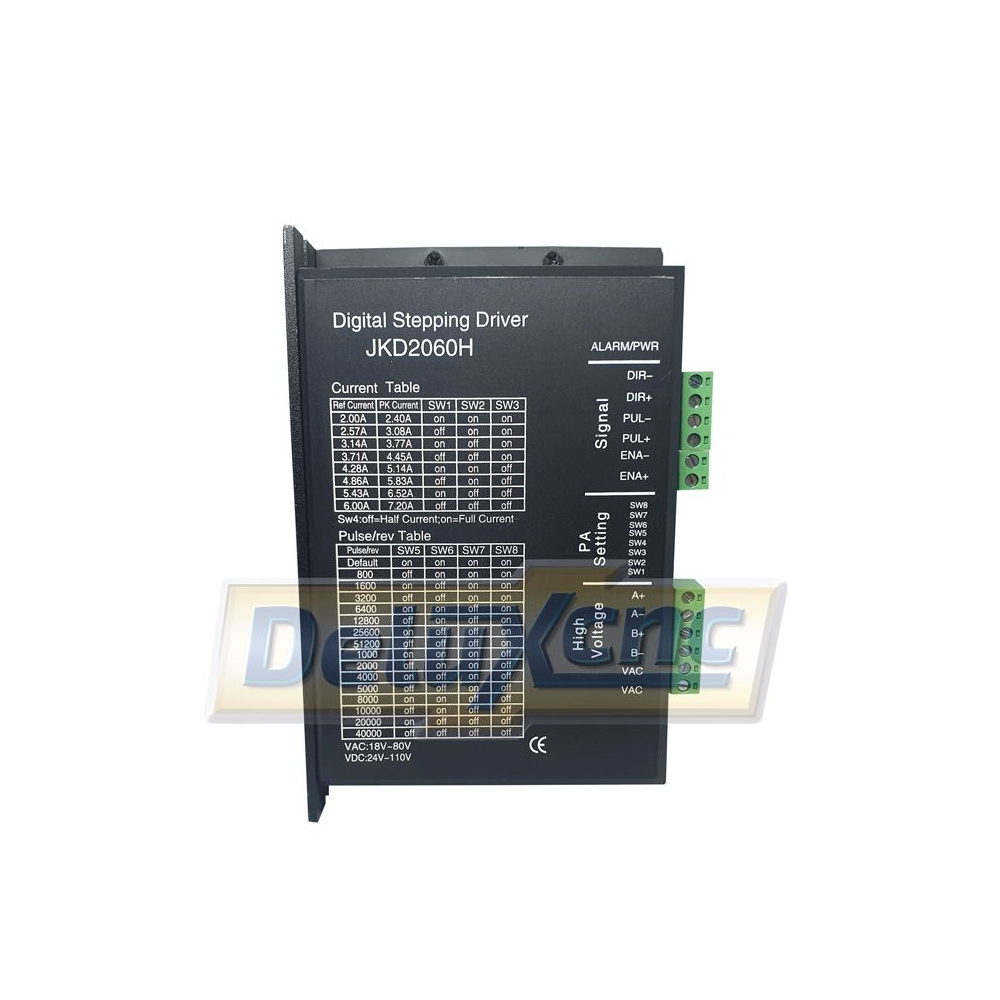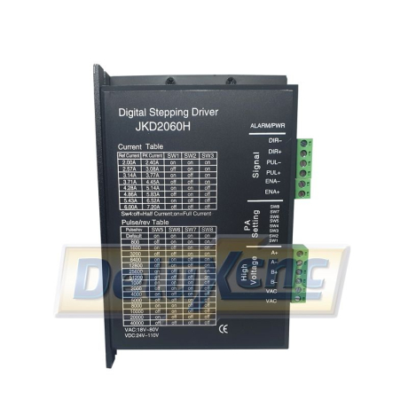 JKD2060H is a type of two-phase hybrid stepping motor driver, The drive voltage of which is from 24VDC to 80VDC. It is designed for use with 2-phase hybrid stepper motor of all kinds with 57mm to 110mm outside diameter and less than 8.0A phase current. This circuit that it adopts is similar to the circuit of servo control which enables the motor run smoothly almost without noise and vibration. Hording torque when DM860A run under high speed is also significantly higher than the other two-phase driver, what’s more, the positioning accuracy is also higher. It is widely used in middle and big size numerical control devices such as curving machine, CNC machine, and computer embroider machine, packing machines and so on.