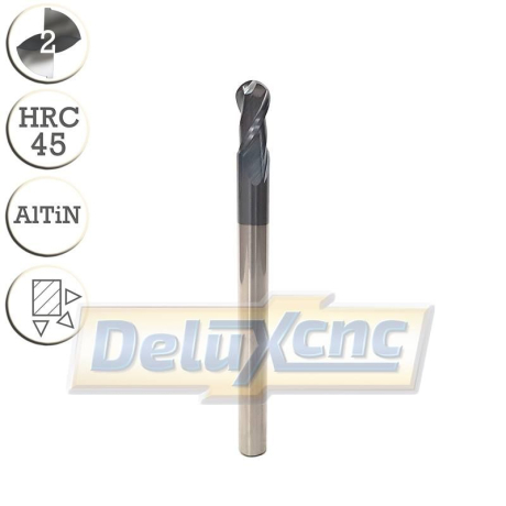 Dvojbritá karbidová guľová fréza s ochranným povlakom AlTiN na všeobecné použitie. Vhodná do železa, ocele... do tvrdosti HRC45.