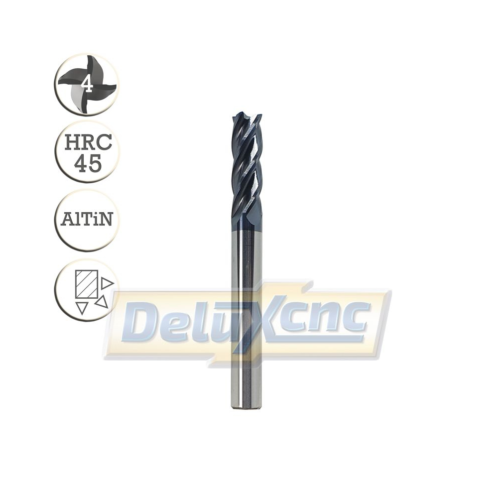 Štvorbritá karbidová fréza s ochranným povlakom AlTiN na všeobecné použitie. Vhodná do železa, ocele do tvrdosti HRC45.