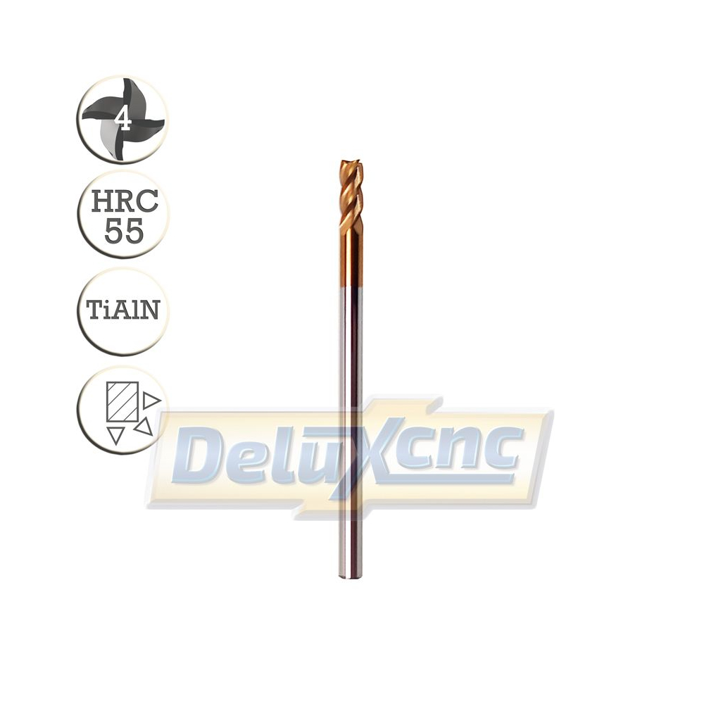 Štvorbritá karbidová fréza s ochranným povlakom TiAIN na všeobecné použitie. Vhodná do železa a ocele do tvrdosti HRC55.