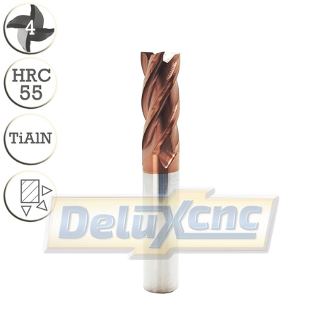 Štvorbritá karbidová fréza s ochranným povlakom TiAIN na všeobecné použitie. Vhodná do železa, ocele do tvrdosti HRC55.