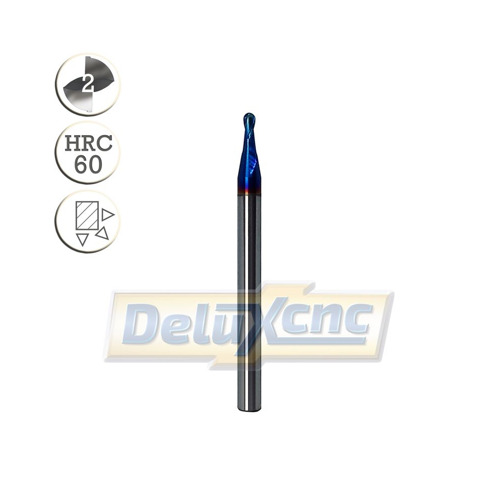 Dvojbritá guľová tvrdokovová fréza s ochranným povlakom TiAlN F-NaNo Blue na použitie do extra tvrdých materiálov. Vhodná do nerezovej ocele a ocele do tvrdosti HRC62.