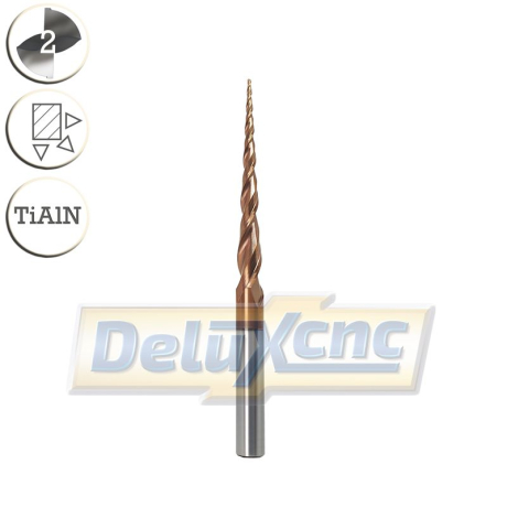 Dvojbritá karbidová kužeľová fréza s ochranným povlakom TiAlN na všeobecné použitie. Vhodná do dreva a materiálov do tvrdosti HRC55.