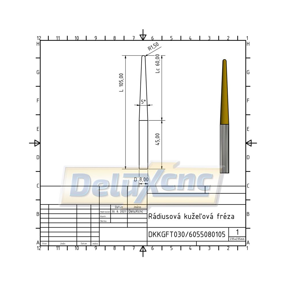 Dvojbritá karbidová kužeľová fréza s ochranným povlakom TiAlN na všeobecné použitie. Vhodná do dreva a materiálov do tvrdosti HRC55.