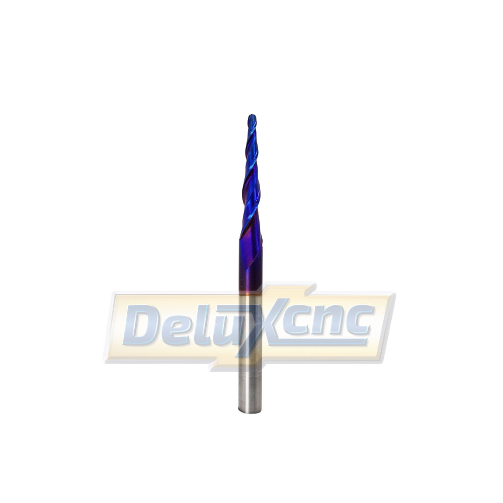 Dvojbritá karbidová kužeľová fréza s ochranným povlakom NANO blue na všeobecné použitie. Vhodná do dreva a materiálov do tvrdosti HRC55.