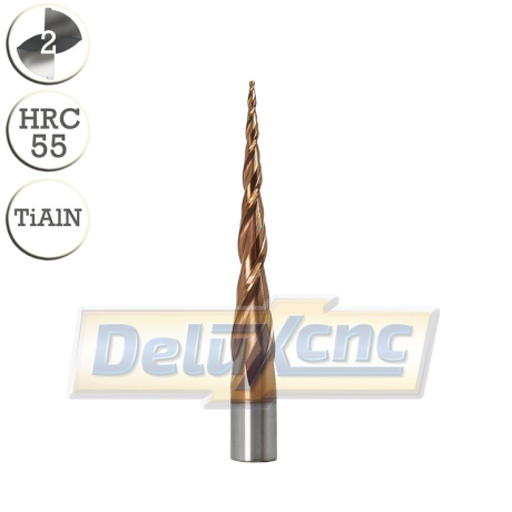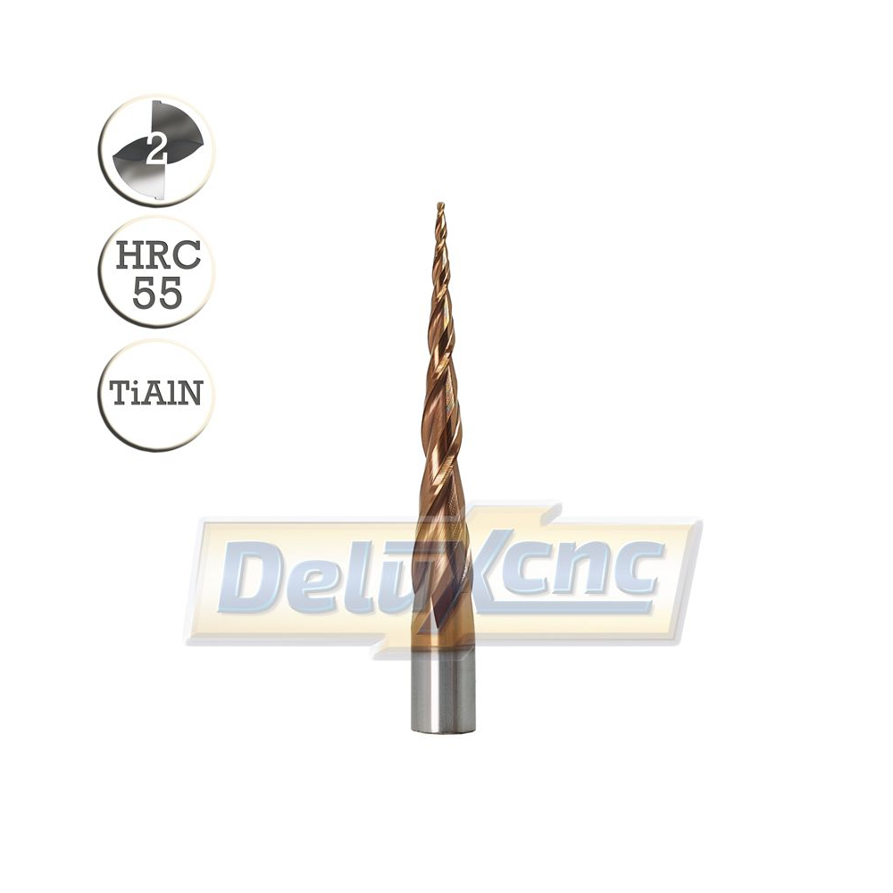 Vysokokvalitná dvojbritá kužeľová karbidová guľová fréza s ochranným povlakom TiAlN na všeobecné použitie. Vhodná do dreva a materiálov do tvrdosti HRC55.