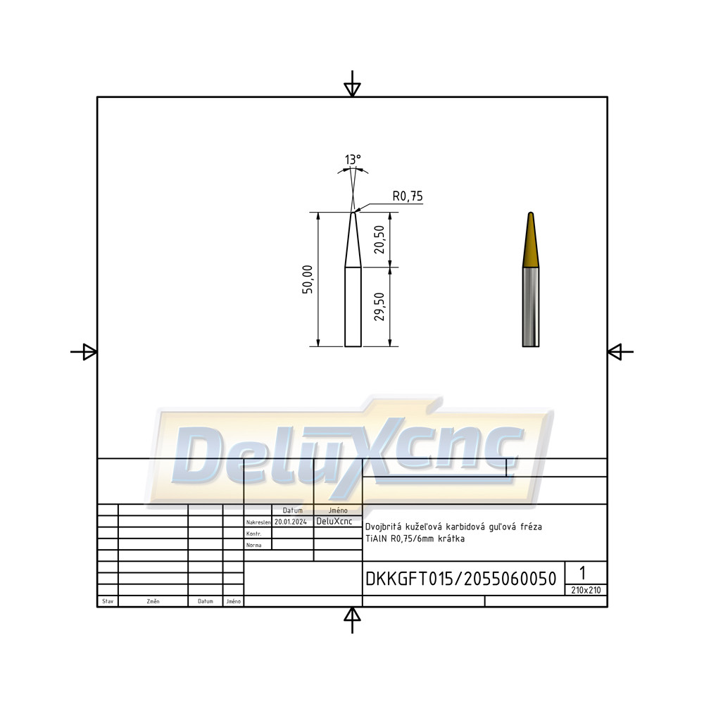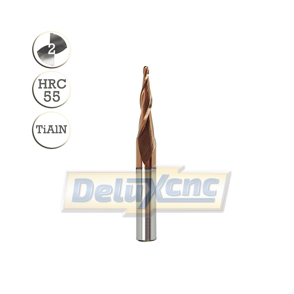 Dvojbritá karbidová kužeľová fréza s ochranným povlakom TiAlN na všeobecné použitie. Vhodná do dreva a materiálov do tvrdosti HRC55.