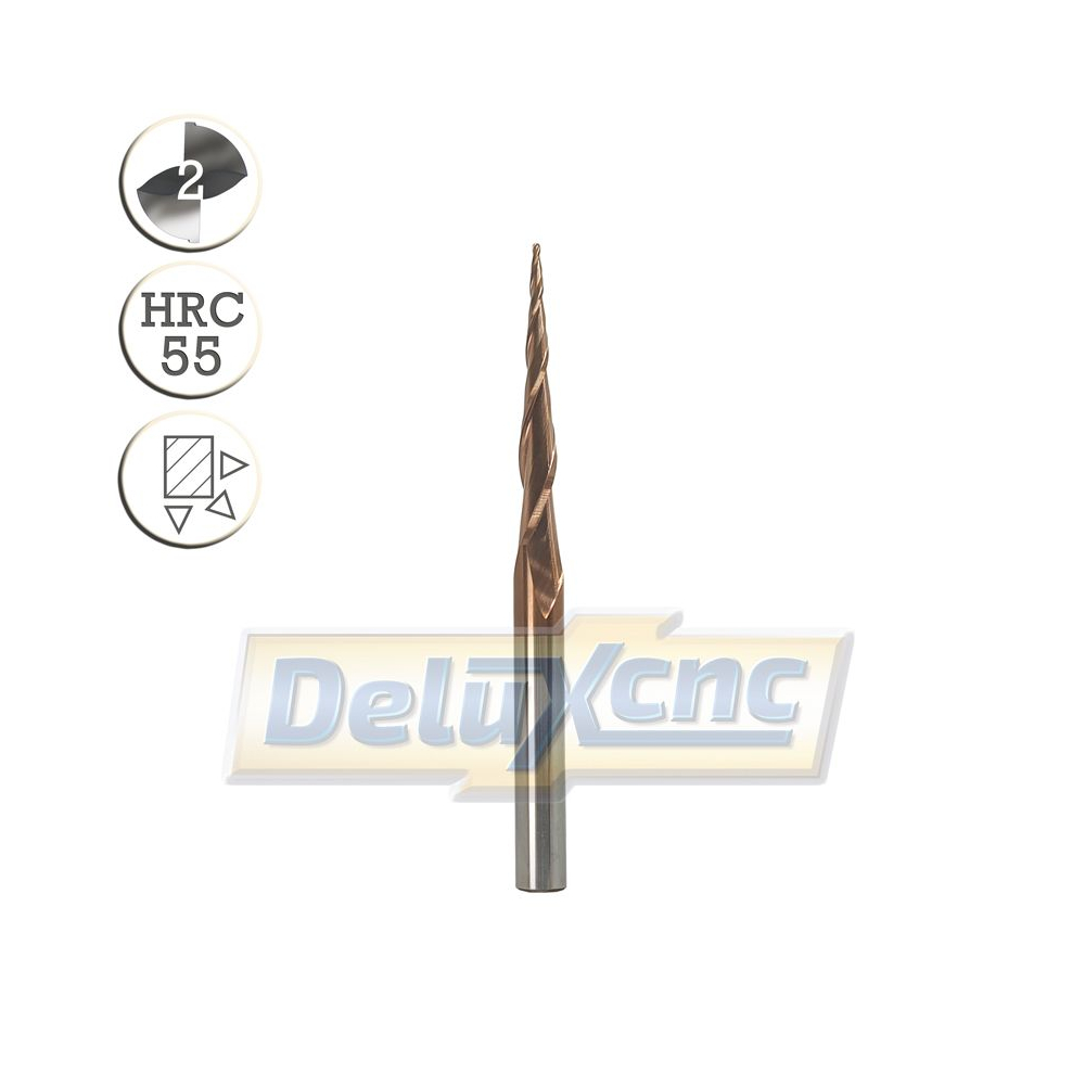Dvojbritá karbidová kužeľová fréza na všeobecné použitie. Vhodná do dreva a materiálov do tvrdosti HRC55.