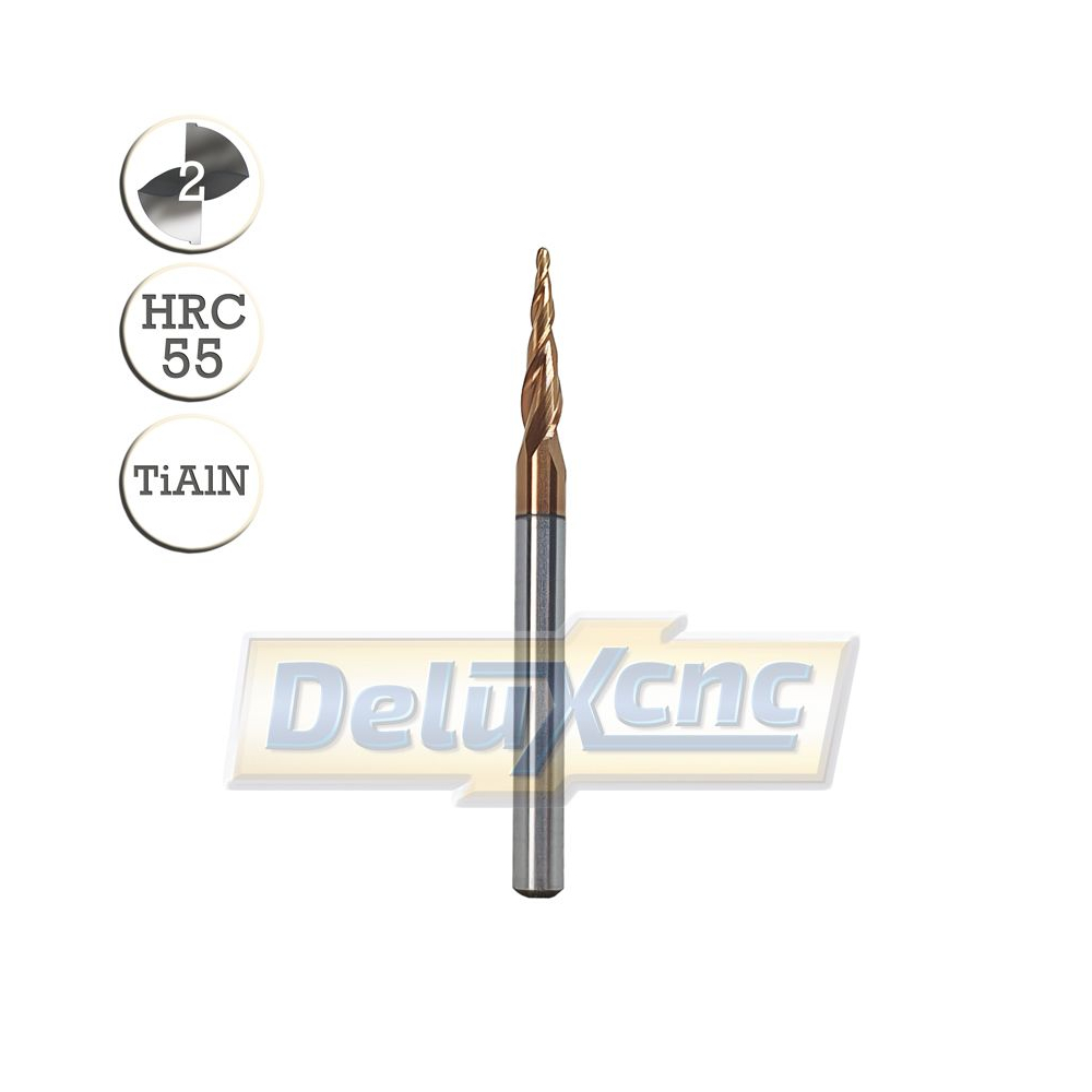 Dvojbritá karbidová kužeľová fréza s ochranným povlakom TiAlN na všeobecné použitie. Vhodná do dreva a materiálov do tvrdosti HRC55.