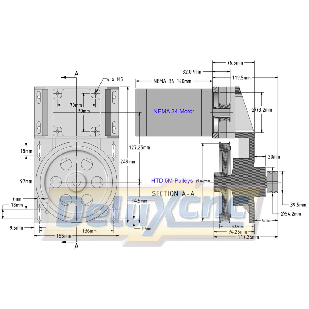 Redukčný pomer prevodovky je 5:1 (HTD 5M veľká kladka 90 zubov , HTD 5M malá kladka 18 zubov – 90/18=5 )
